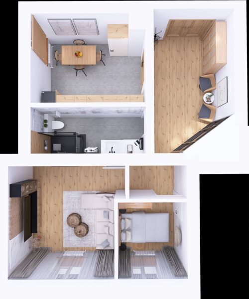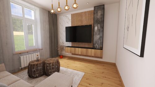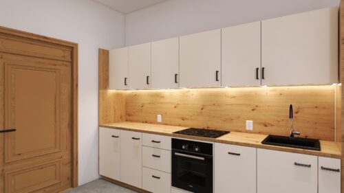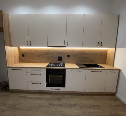 będą panele oraz kafle. Kuchnia będzie wyposażona w meble w zabudowie,